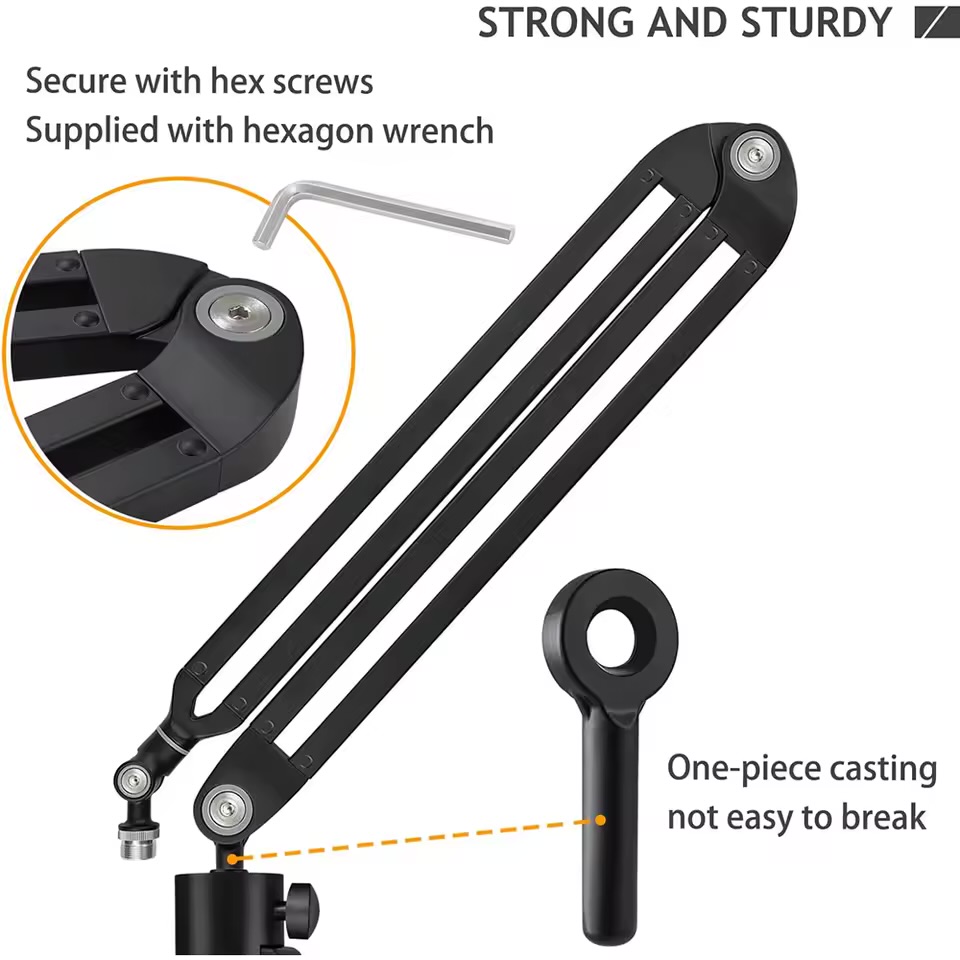 - Strong Metal Construction: Durable, lightweight alloy frame supports most standard mics (up to 1.5 kg).